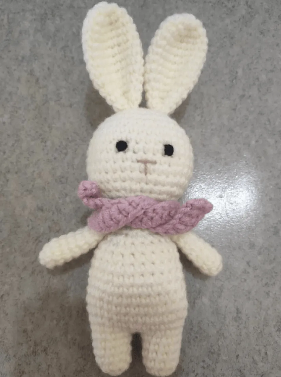 Design Élégant et Artisanal : Un lapin au crochet avec une écharpe rouge, réalisé à la main, offrant un style distinctif et attrayant.